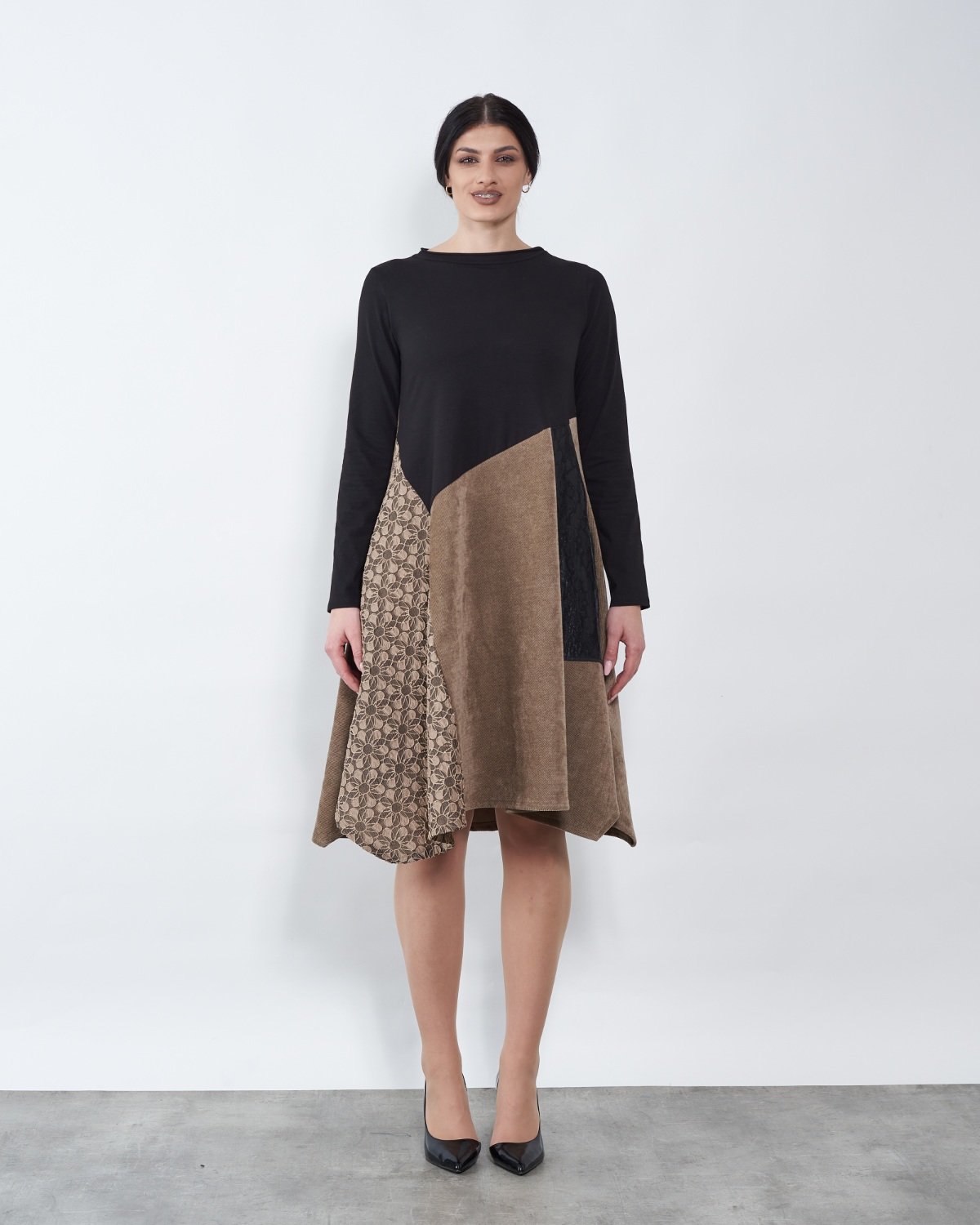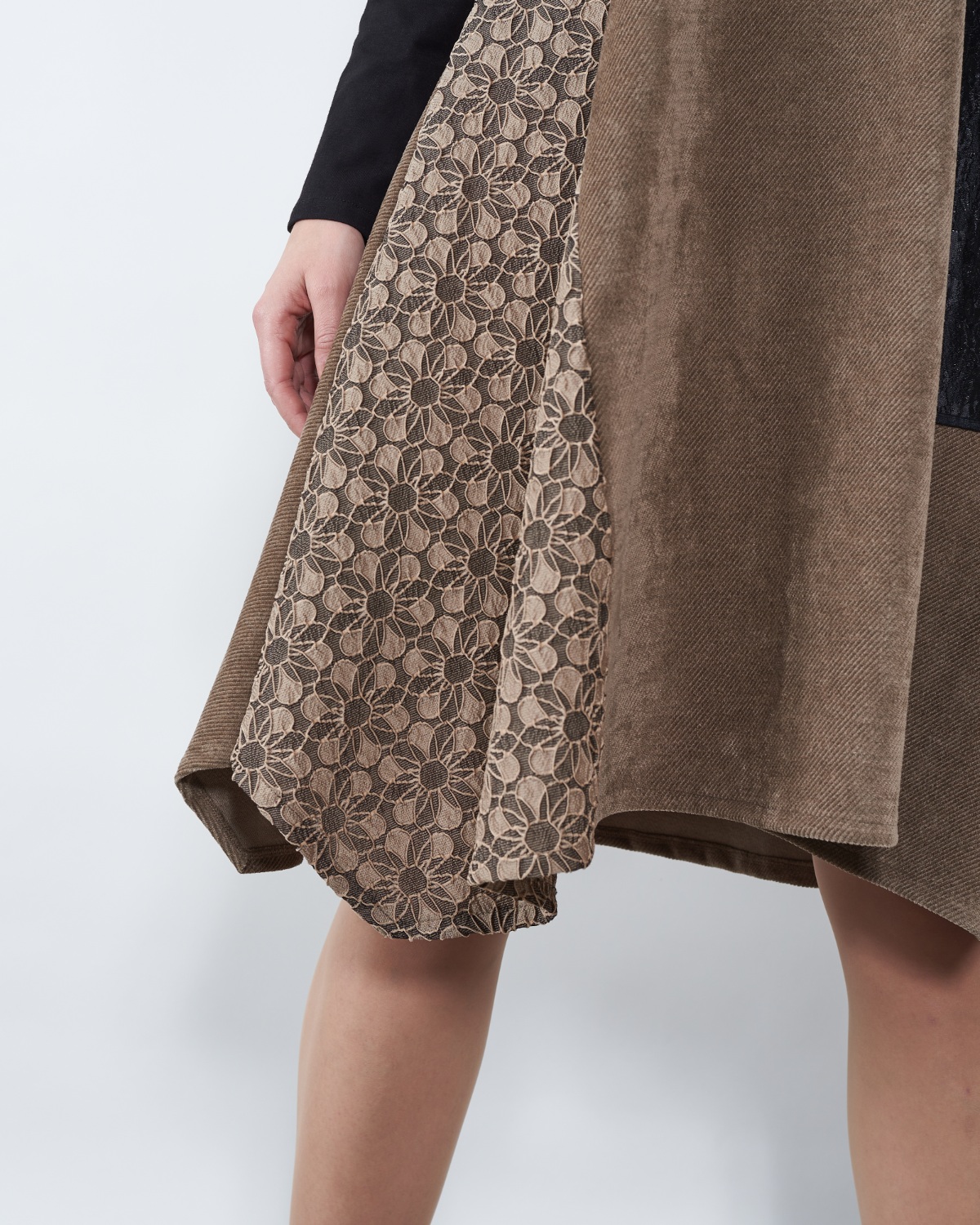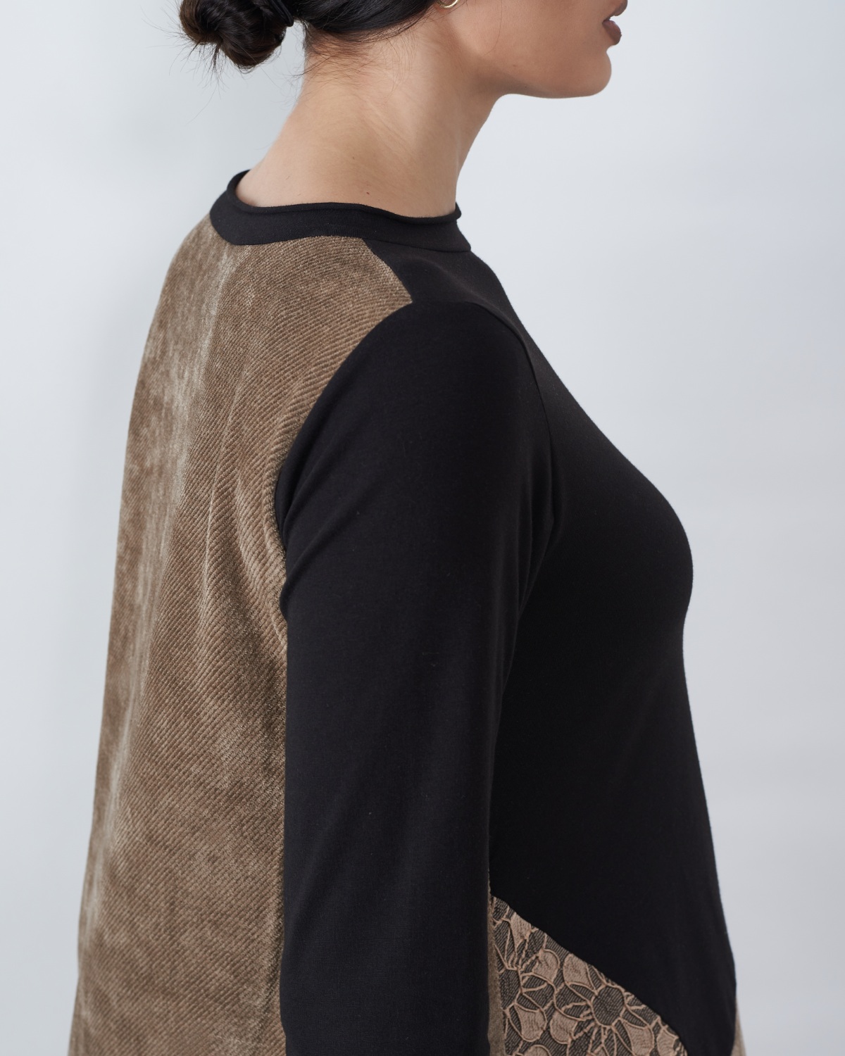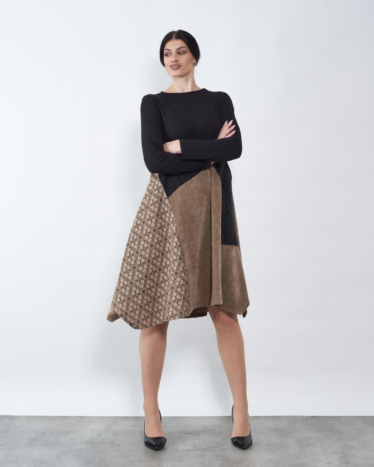 Kombinacija različitih tkanina potpomaže sakrivanju nedostataka u području struka i bokova.