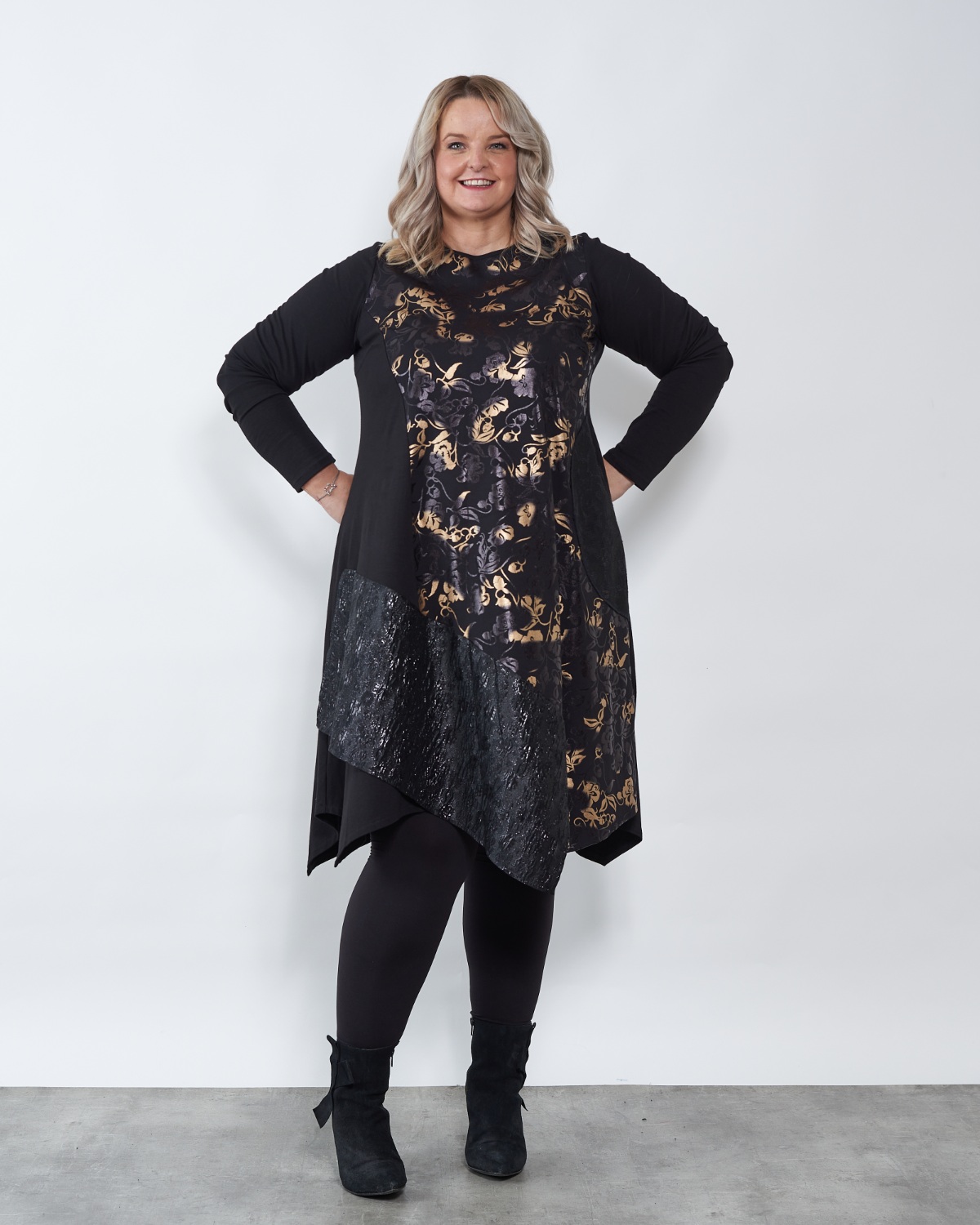 U prednjem dijelu haljina je obogaćena umetcima koji dodatno vizualno stanjuju figuru.