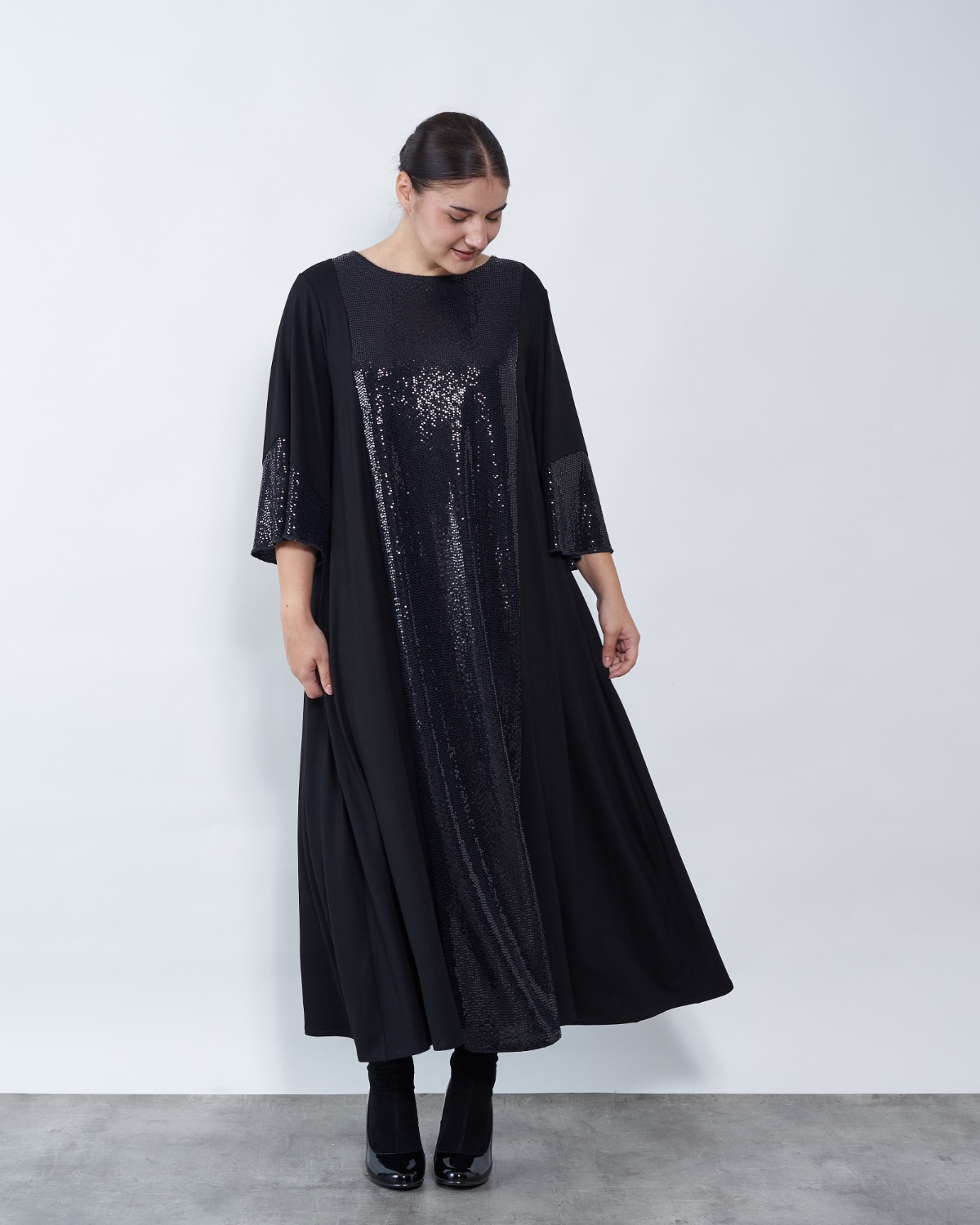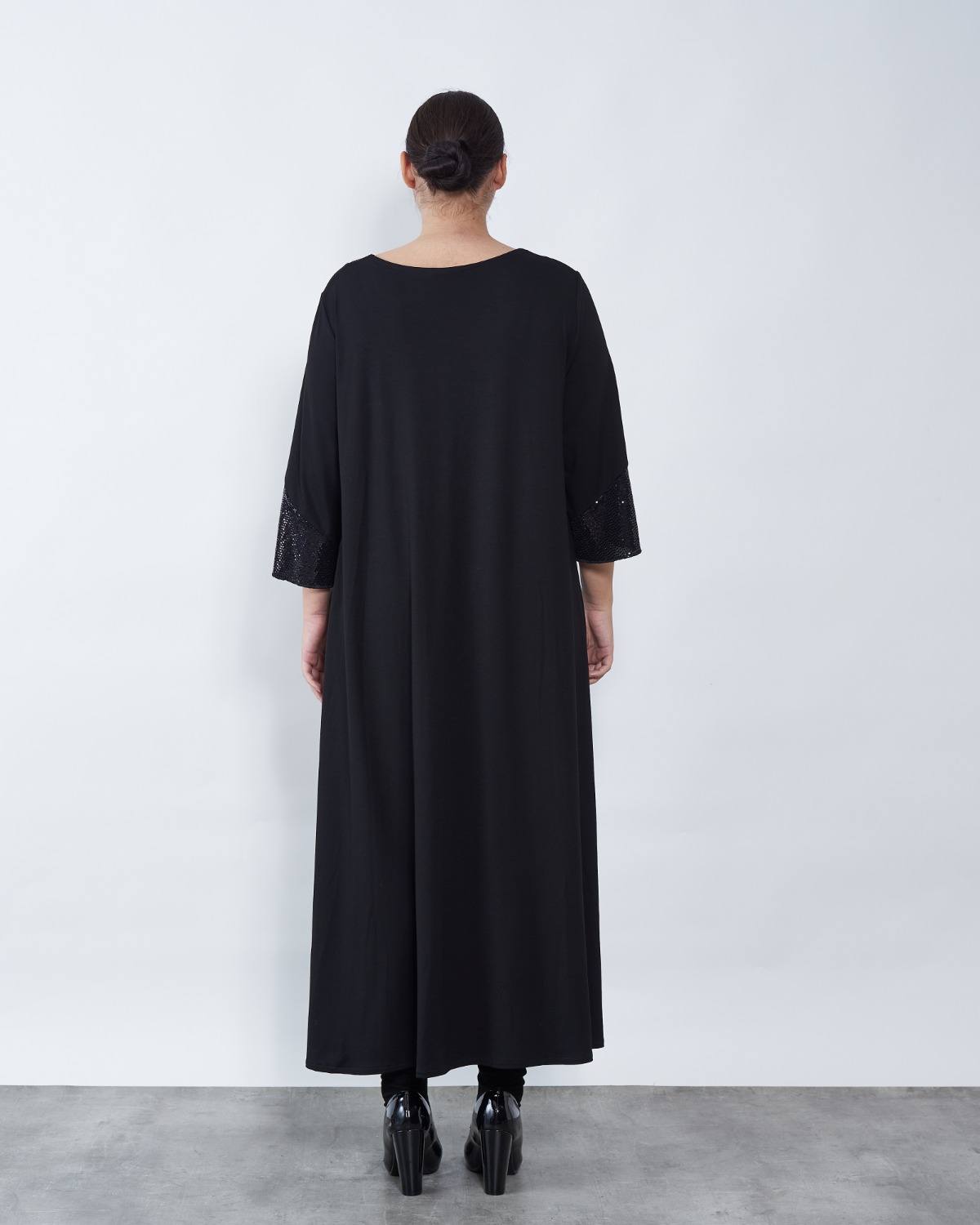 Haljinu krase crne šljokice, te lepršavi rukavi.