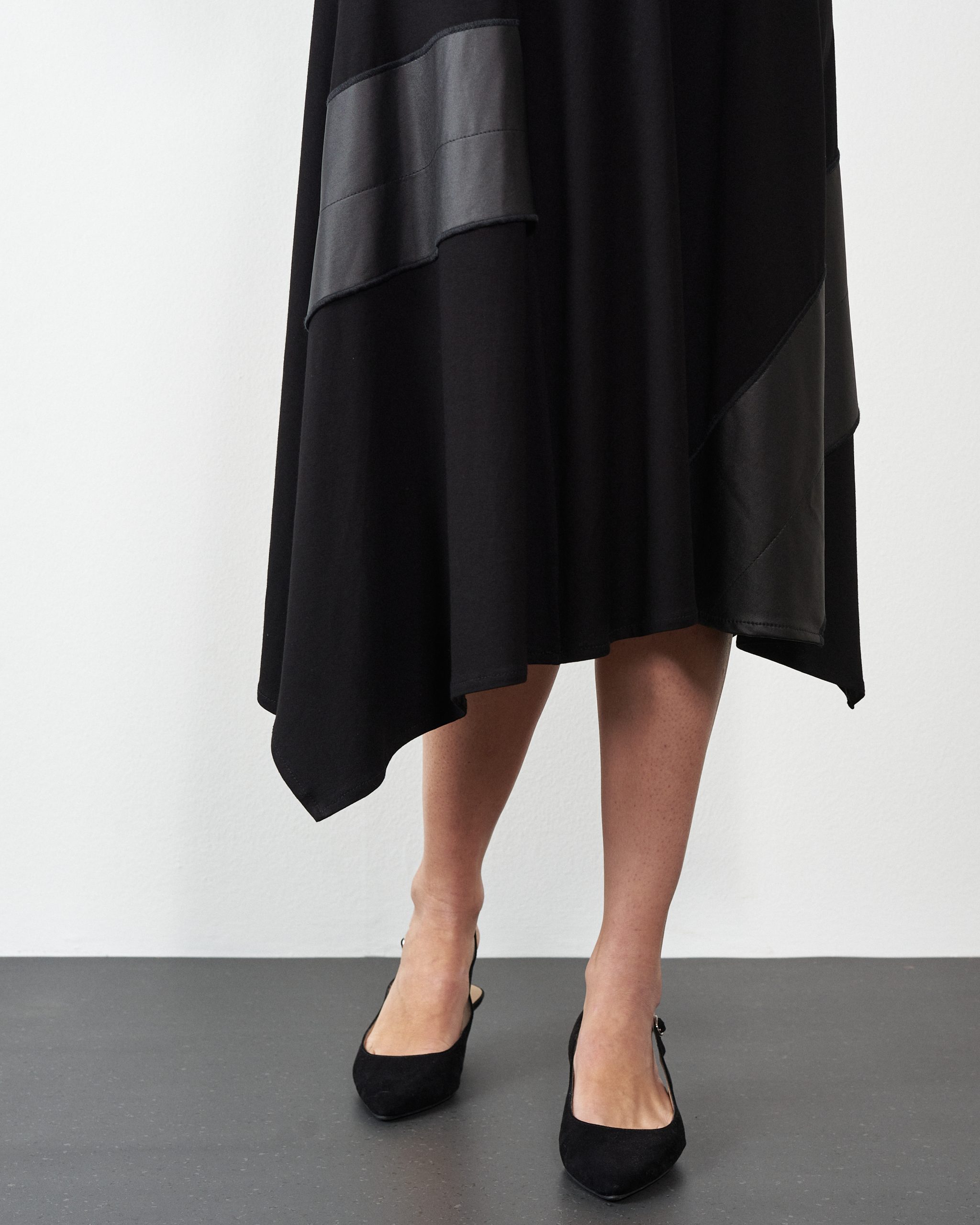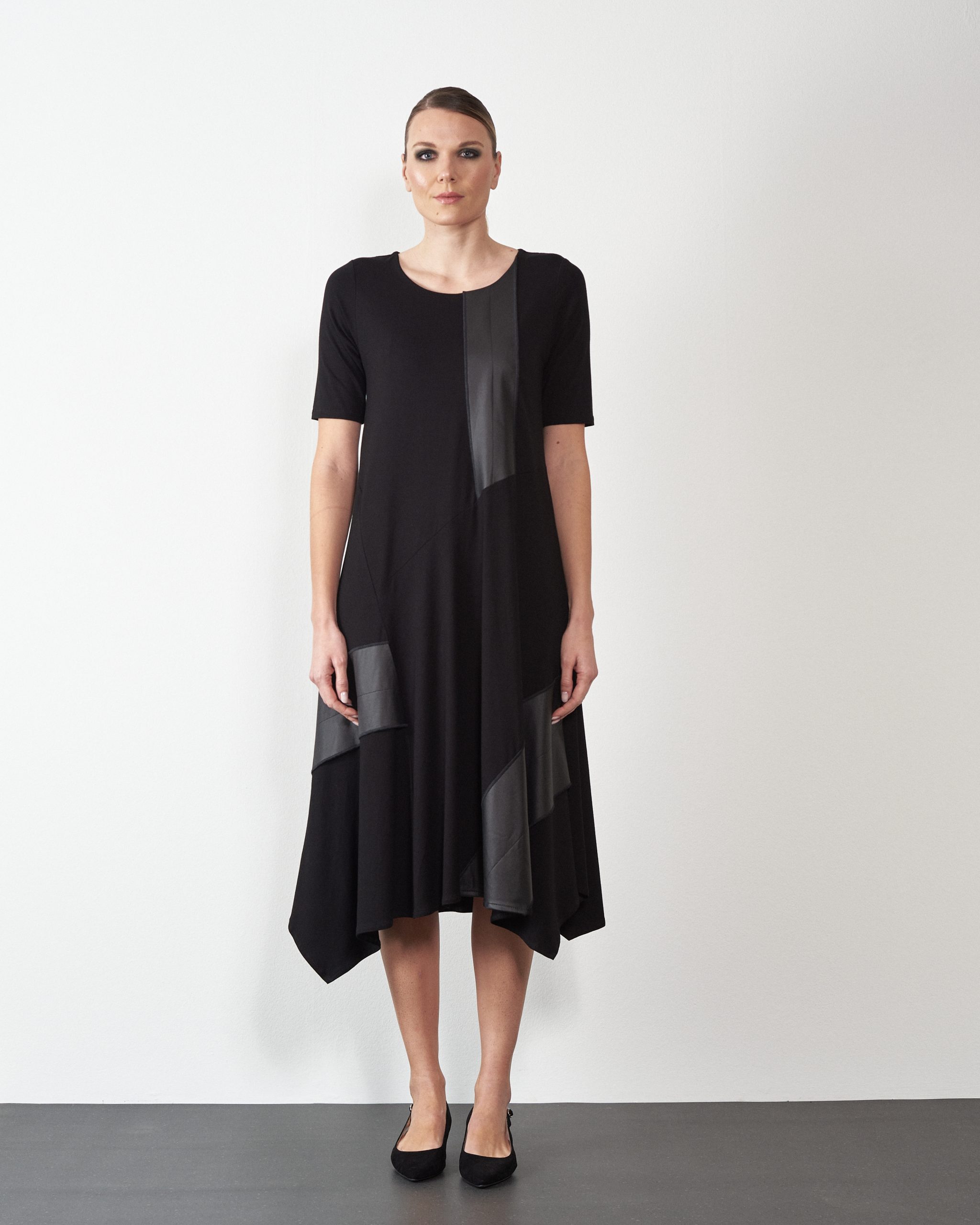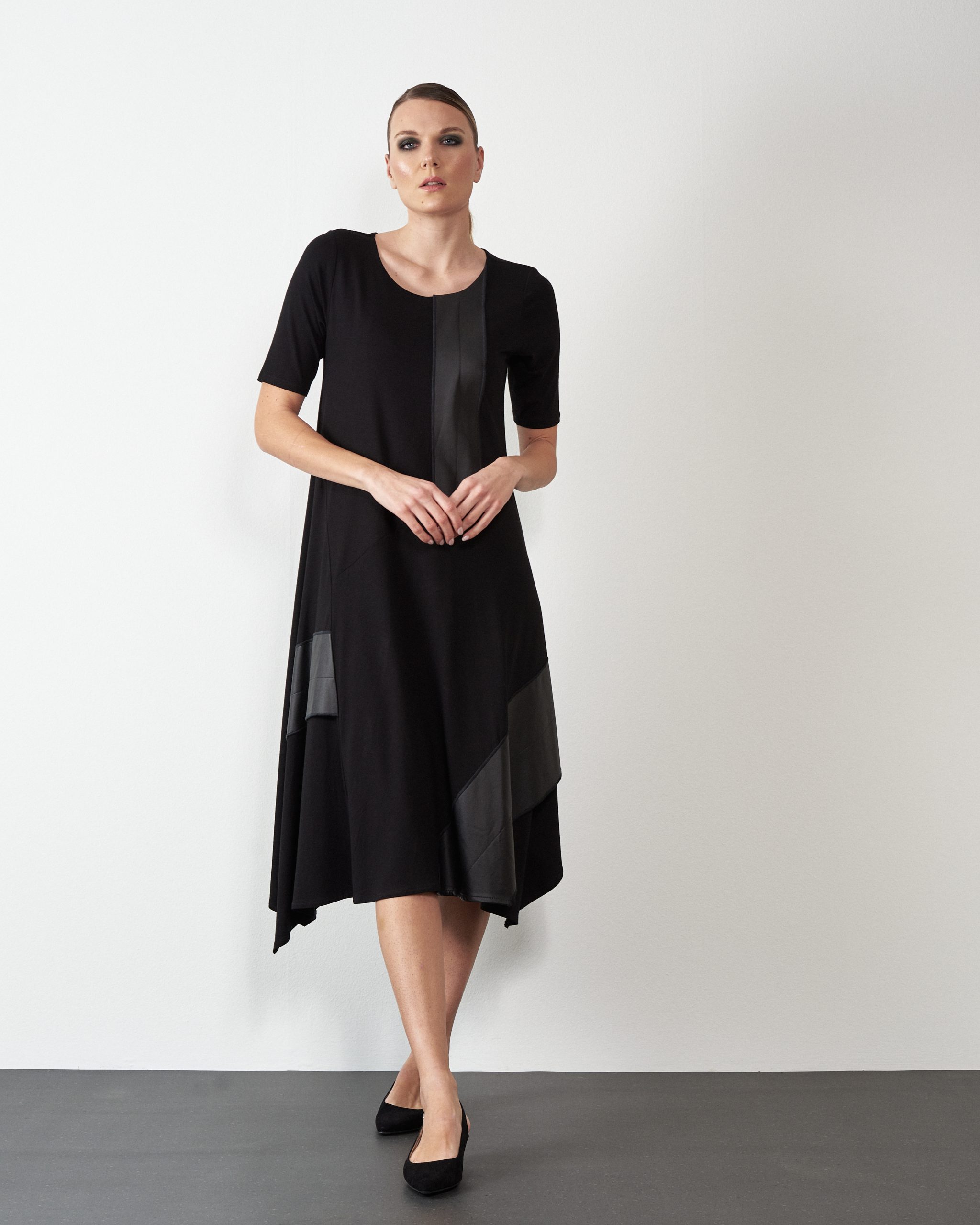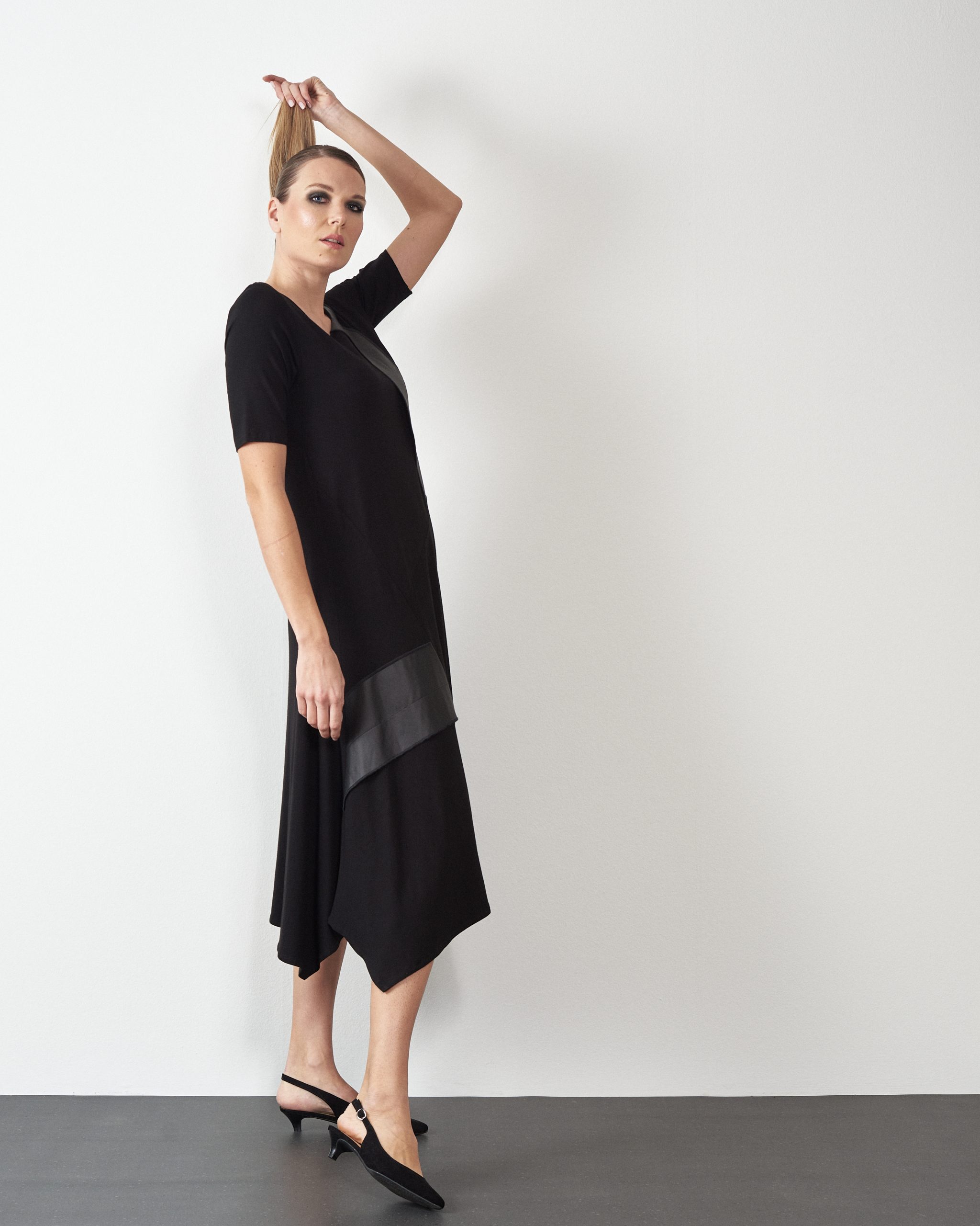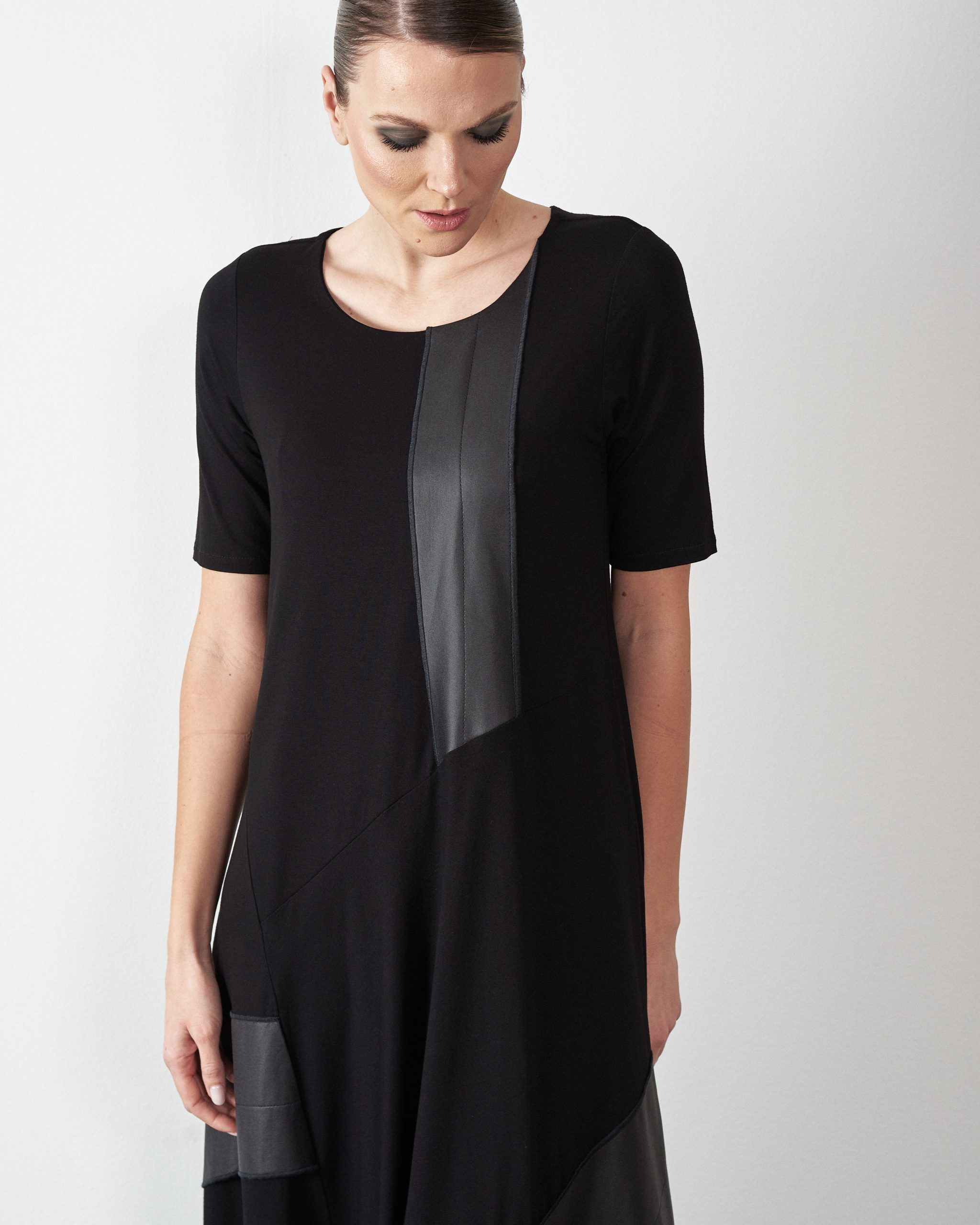 U gornjem dijelu haljina prati liniju tijela te završava asimetrijom.