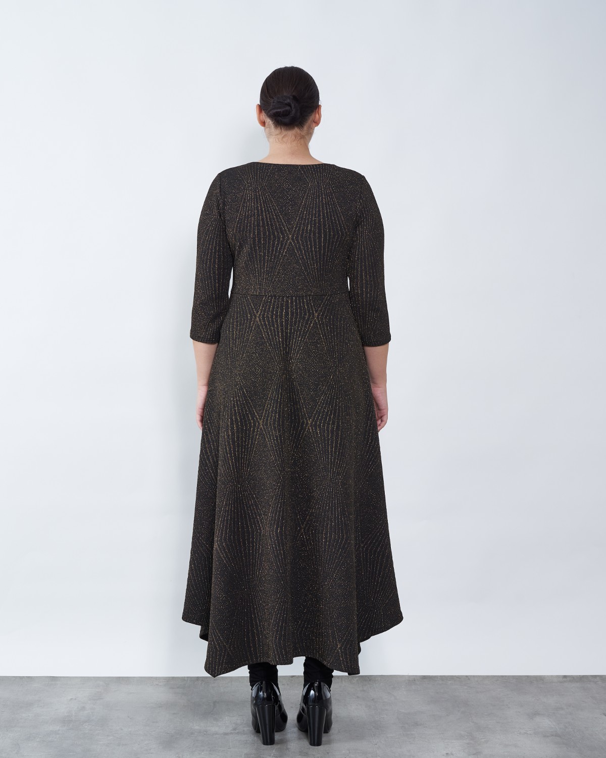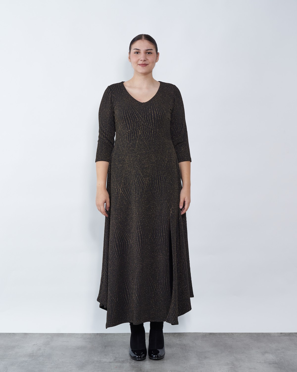 Haljina sa "V" izrezom na lijevoj strani ima rasporak.