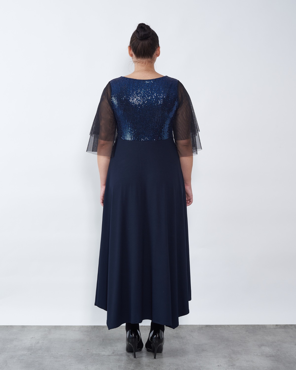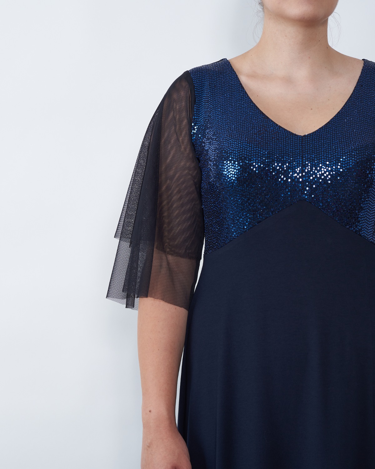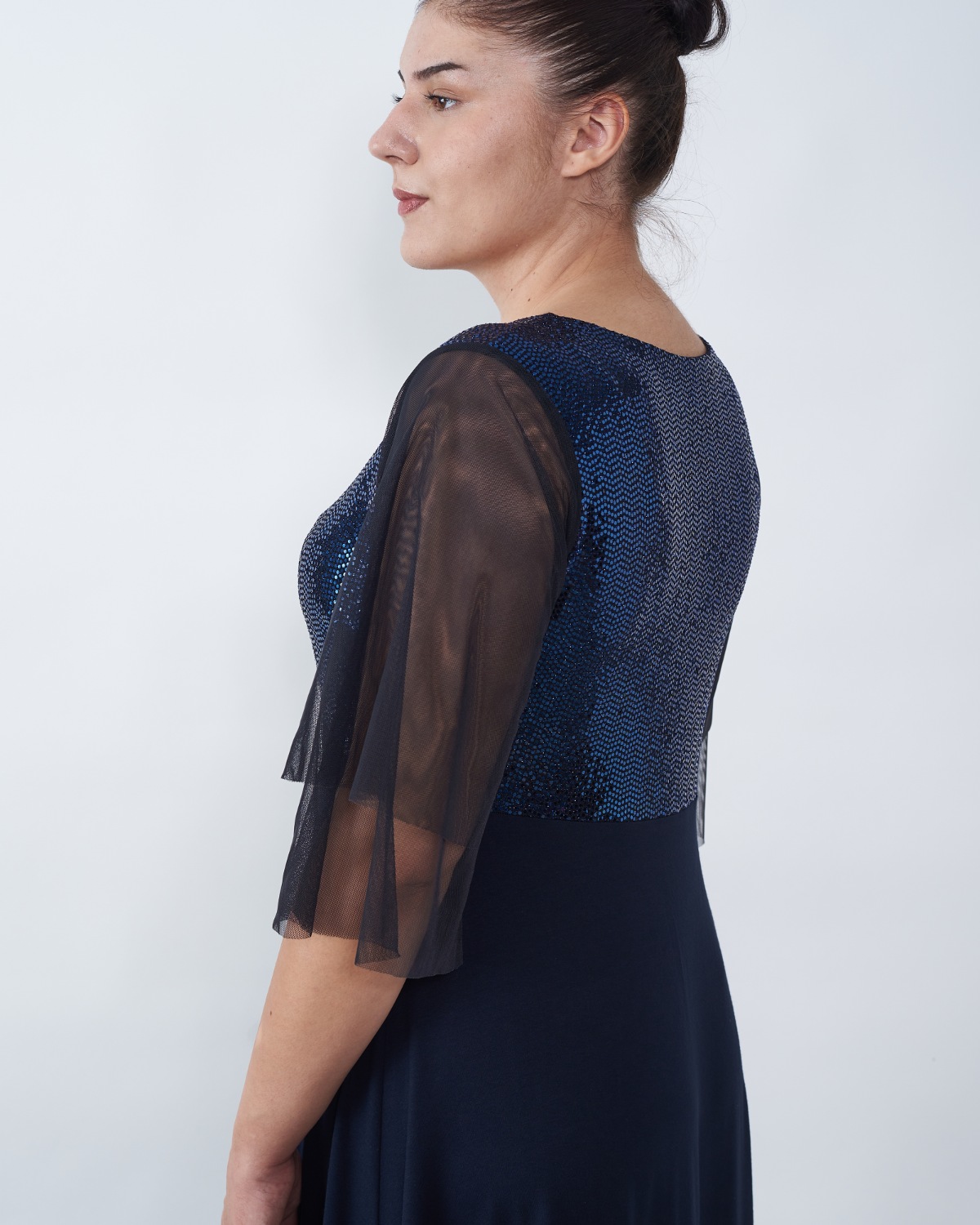 Haljina ima "V" izrez te je u gornjem dijelu obogaćena crnim šljokama.