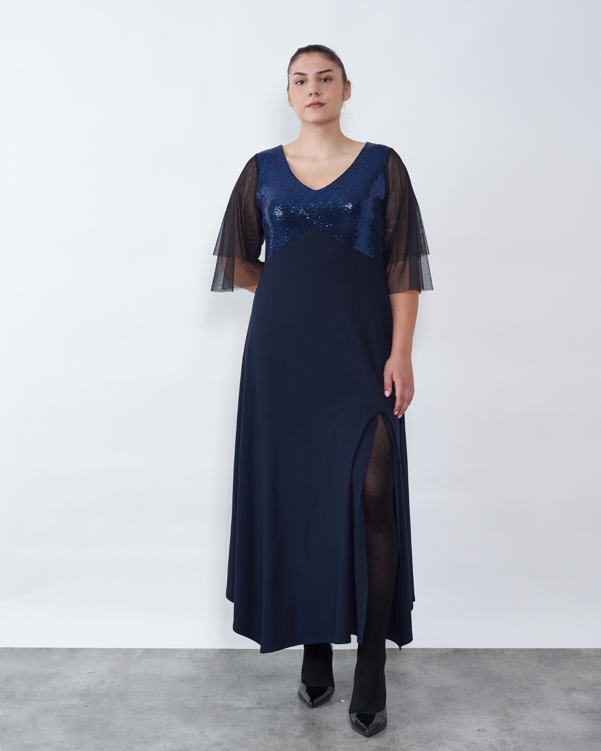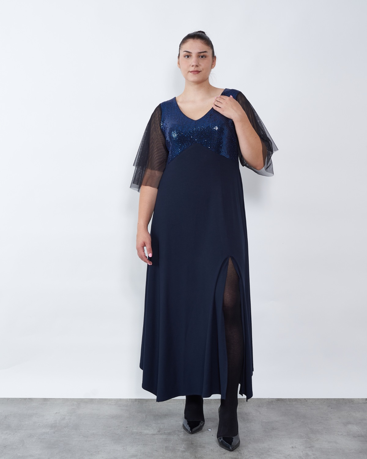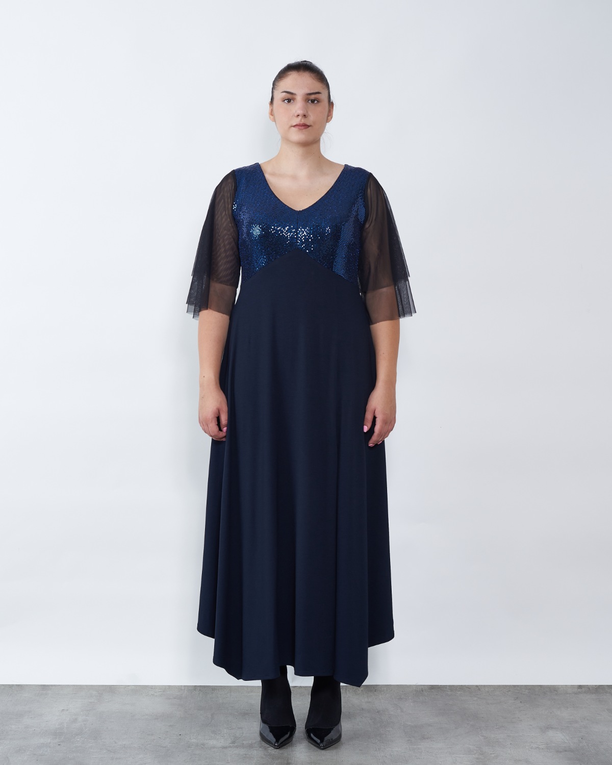 Haljina ima "V" izrez te je u gornjem dijelu obogaćena crnim šljokama.