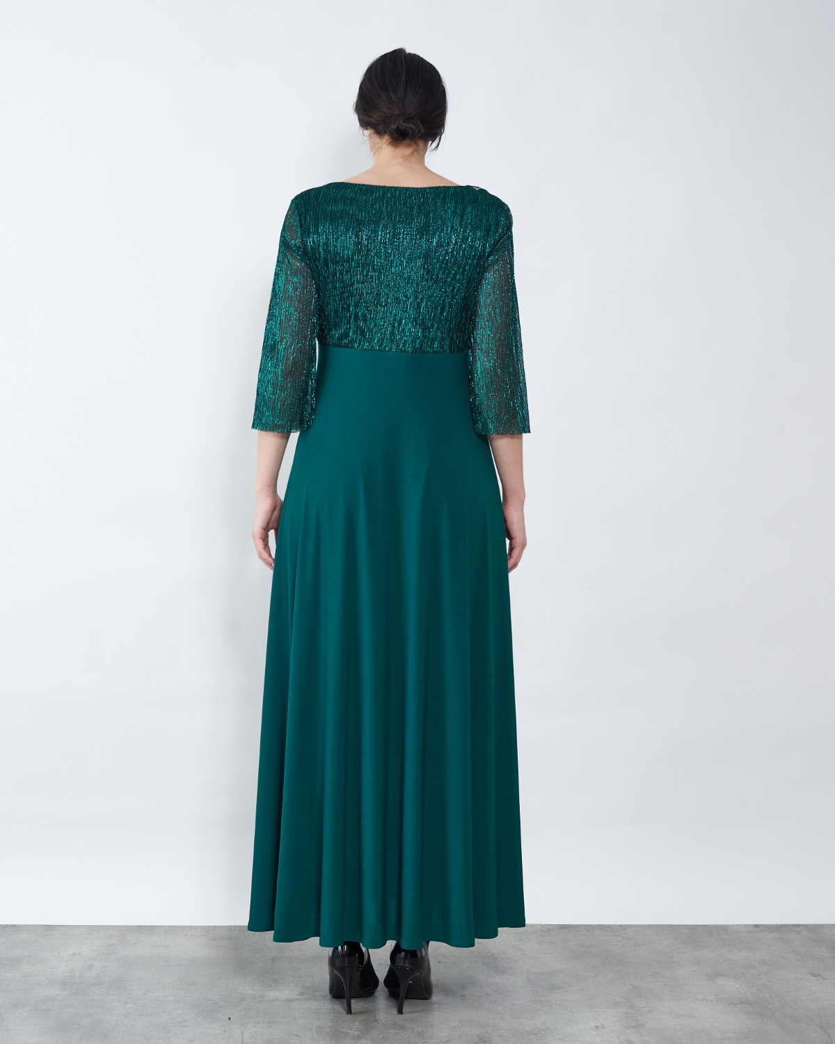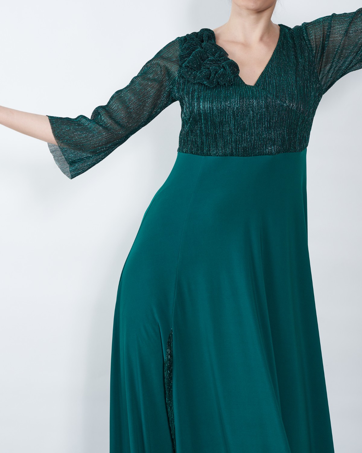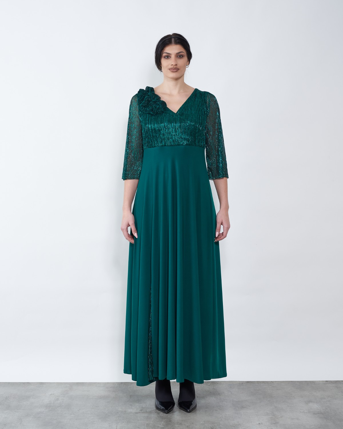 Model koji lijepo pada krasi zeleni lame, te dodatak u obliku ruže.