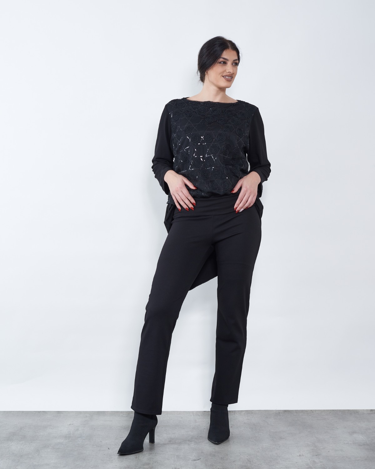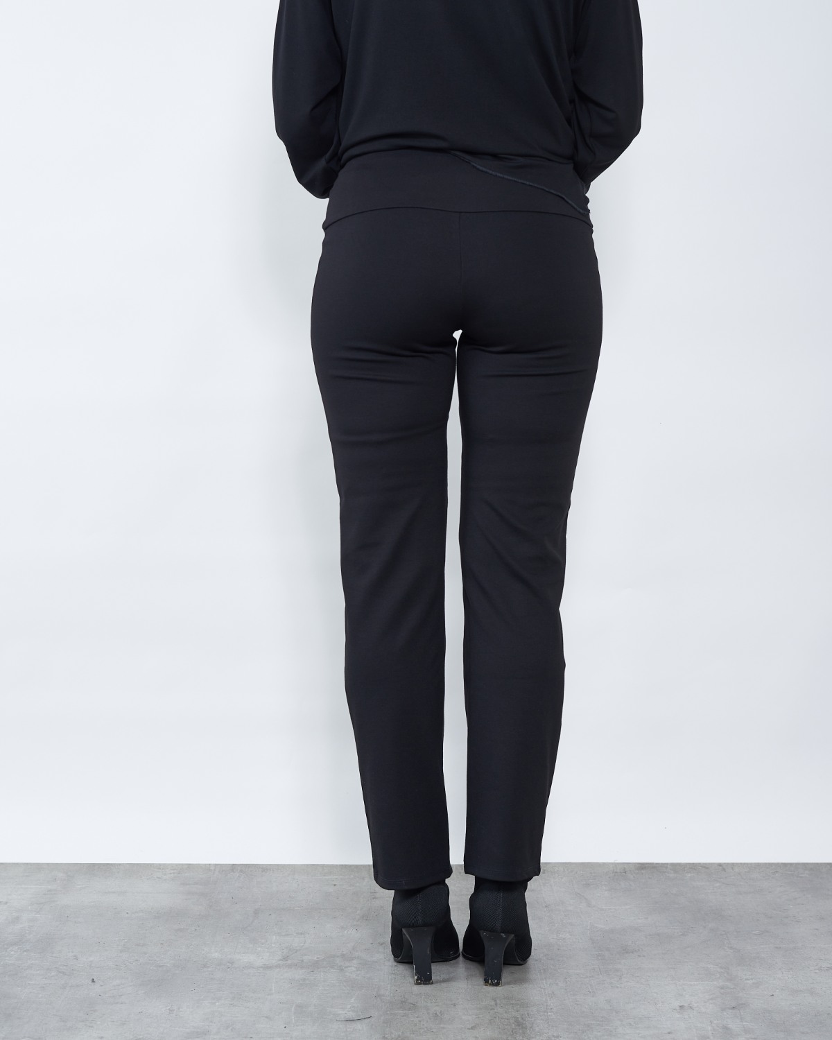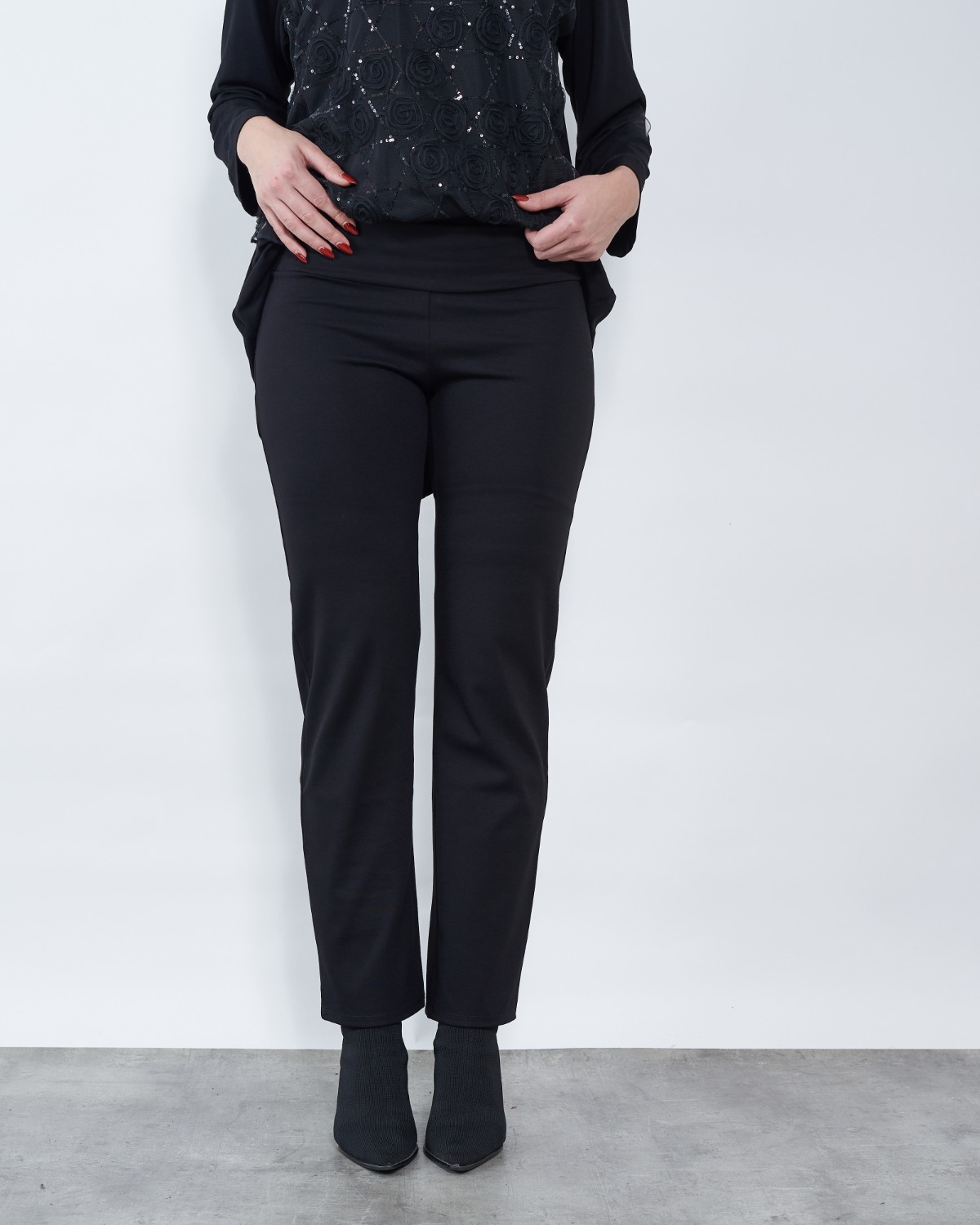 Hlače ravnog kroja sa širokom pasicom u struku.
