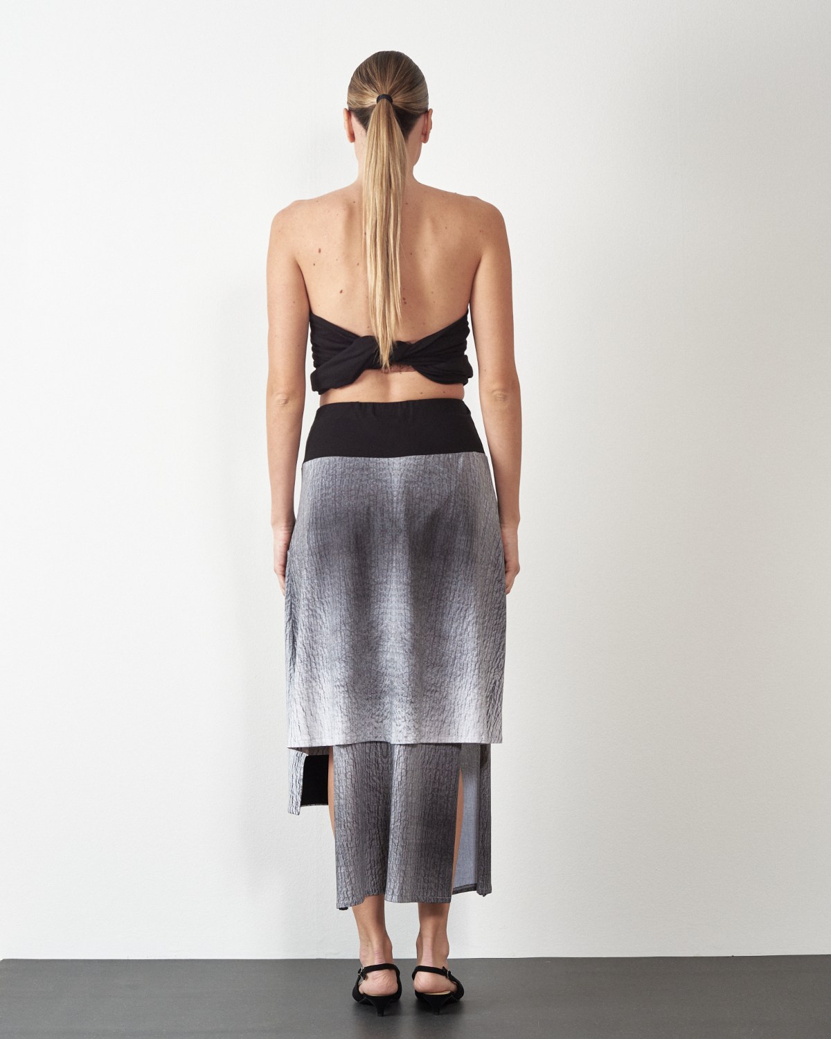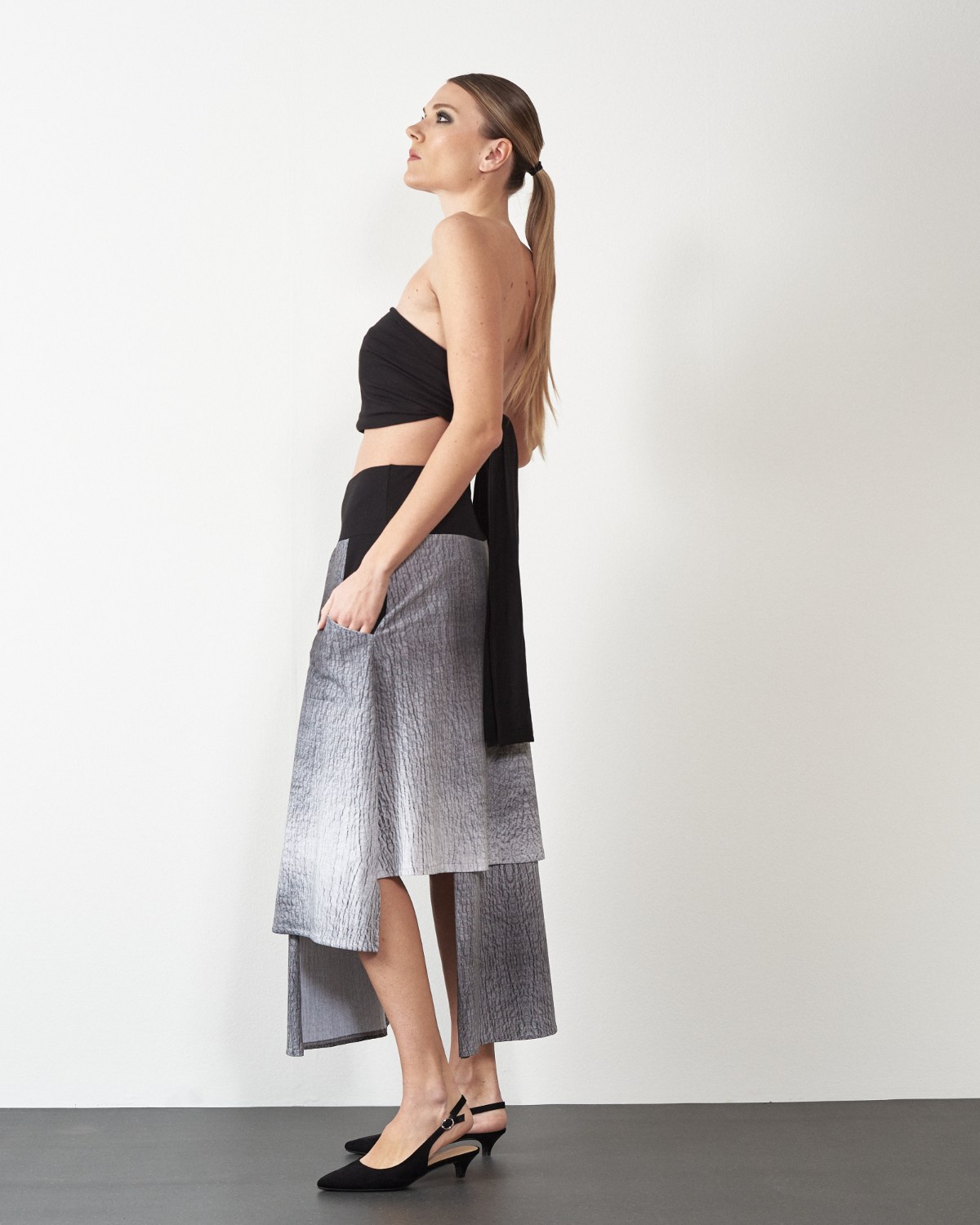 Pamučna, slojevita suknja sa širom pasicom u struku.