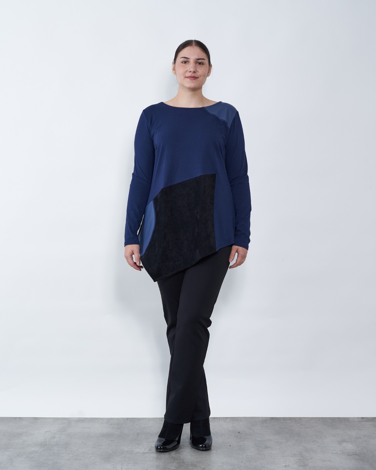 Monotonija plave boje razbijena je umetcima od crnog samta i eko kože.