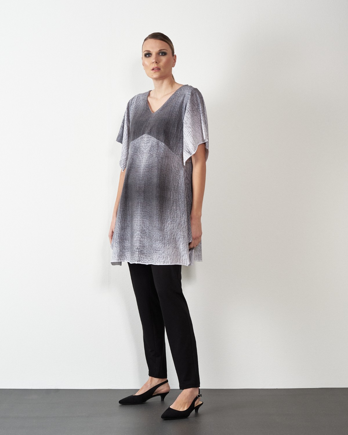 U donjem dijelu tunika je šira, te završava asimetrijom.